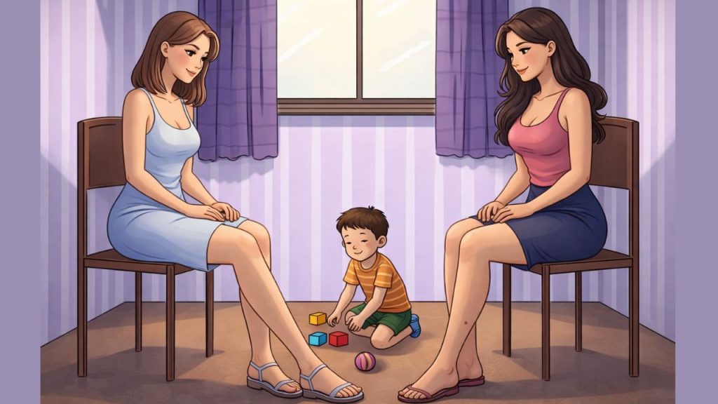Žena s desne strane sjedi opuštenije i njen položaj tijela nije usmjeren prema djetetu na isti način. Upravo ta mala razlika otkriva ono što mnogi ne primijete na prvi pogled.
