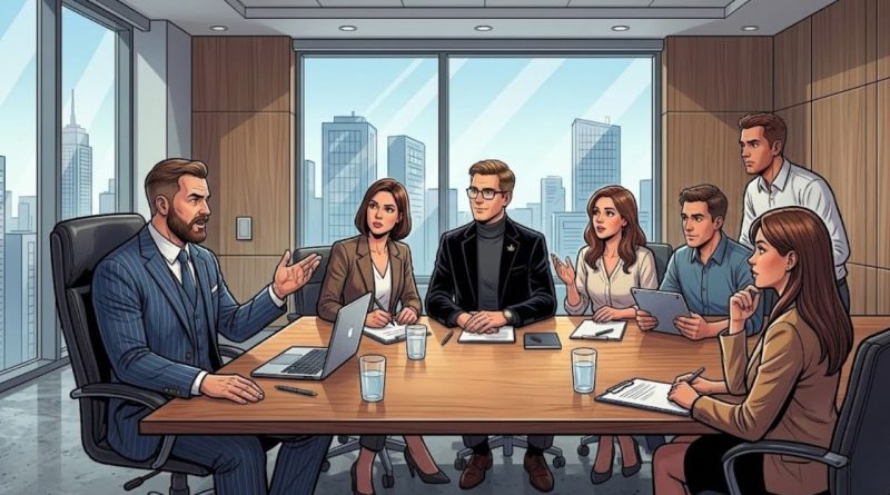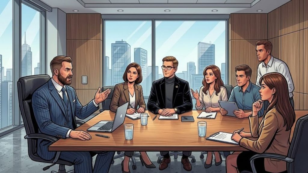 - Pogledi: Svi ostali učesnici sastanka, uključujući i čovjeka koji gestikulira, podsvjesno su okrenuti prema njemu ili čekaju njegovu reakciju.