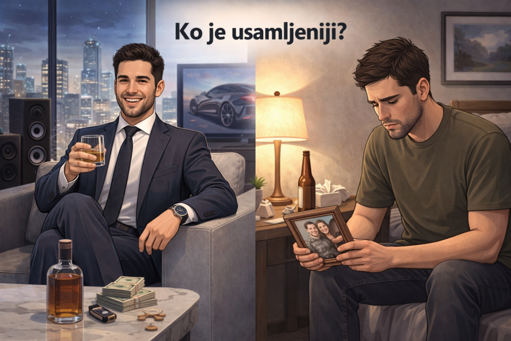 Jedan muškarac okružen je luksuzom, sigurnošću i očiglednim uspjehom. Drugi sjedi sam, u tišini, gledajući staru fotografiju. Pitanje je jednostavno, ali odgovor često zbuni većinu ljudi jer instinktivno povezujemo samoću sa siromaštvom, a sreću sa obiljem.