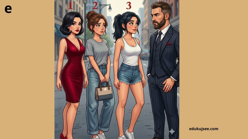 Na slici vidimo muškarca u elegantnom odijelu koji stoji naspram tri žene označene brojevima 1, 2 i 3. Svaka od njih ima drugačiji stil, izraz lica i način držanja, što može navesti na razne pretpostavke. Neki će pokušati pogoditi na osnovu izgleda, ponašanja ili čak pretpostavljenog karaktera.