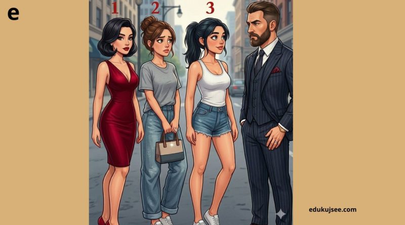 Na slici vidimo muškarca u elegantnom odijelu koji stoji naspram tri žene označene brojevima 1, 2 i 3. Svaka od njih ima drugačiji stil, izraz lica i način držanja, što može navesti na razne pretpostavke. Neki će pokušati pogoditi na osnovu izgleda, ponašanja ili čak pretpostavljenog karaktera.